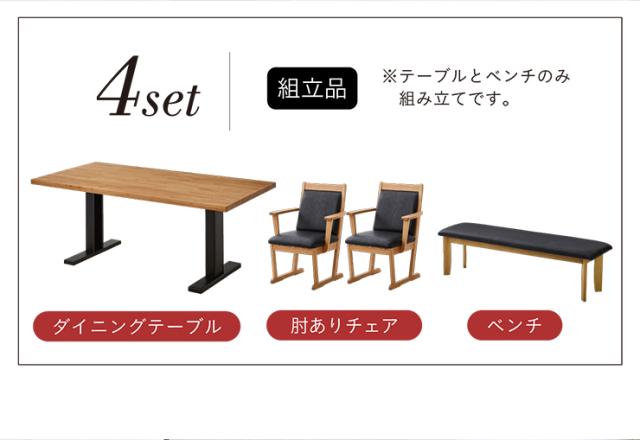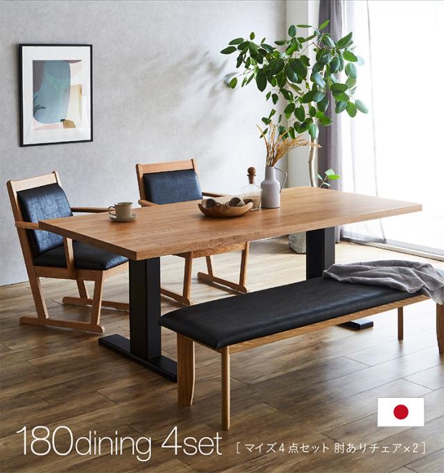 【搬入・組立設置付き】国産 ダイニング4点セット 幅180cm 肘有りチェア マイズ ダイニングセット ダイニングテーブルセット ダイニングテーブル ダイニングチェア ダイニングベンチ テーブル チェア ベンチ ナチュラル 木製