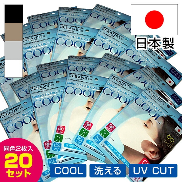 処分価格 UVカット99% 日本製 洗えるマスク 40枚 抗菌抗ウイルス 加工 マスク 同色2枚入×20セット 合計40枚 COOL クール マスク 冷感 立体 男女兼用 3Dマスク 小顔設計 洗える フィットタイプ 花粉対策 ほこり 対策 ホワイト ライトグレー グレージュ ブラック 送料無料