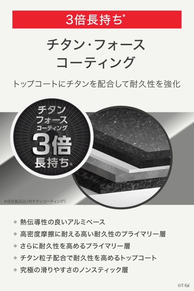 高い耐久性を実現した「チタン・フォースコーティング」で、使い始めのこびりつきにくさが長く続きます。