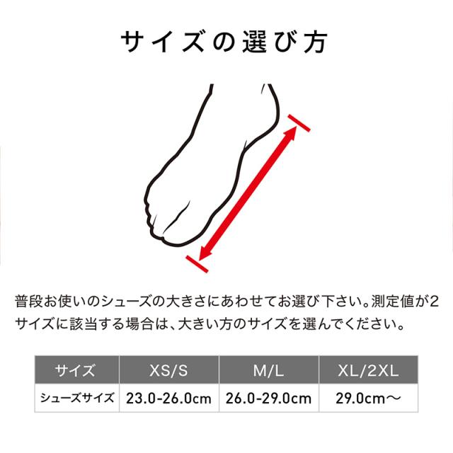 XS/S(シューズサイズ23.0〜26.0cm) M/L(シューズサイズ26.0〜29.0cm) XL/2XL(シューズサイズ29.0cm〜) |