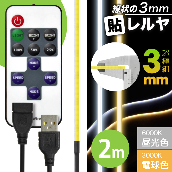 LED USB 照明 テープライト【リモコン式 USB延長ケーブル付】 線状の3mm 貼レルヤ(昼光色/電球色 2m)超極細 明かりムラが無い光