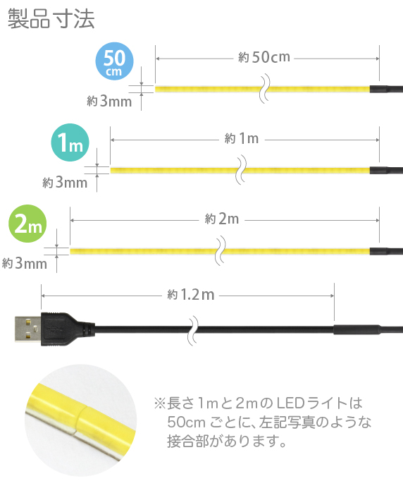 | ライト部:約 長さ2m×幅3mm(発光部は約2mm幅) USBケーブル長:約 120cm |