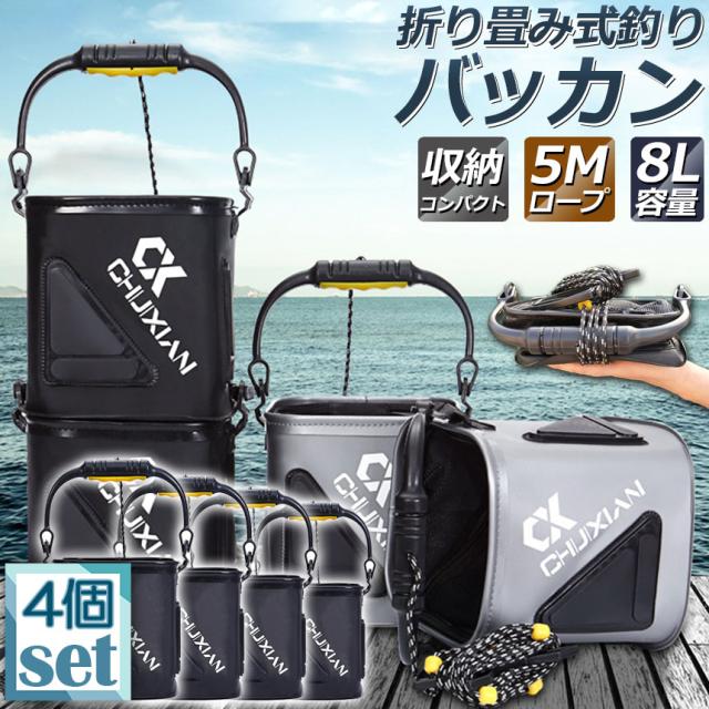 釣り バケツ バッカン 4個セット 水汲み みずくみバケツ 釣り 折りたたみ バケツ 8L チャック付き 魚が逃げない ロープ 5m EVA 海釣り 生かしバケツ 釣り 水くみバケツ アウトドア コンパクト