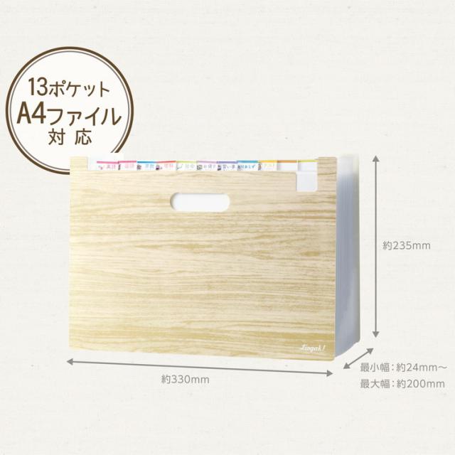 難しいプリント管理のお悩みも解決!ぽいっ!と入れるだけぜんぶひとまとめ♪にできるボックスファイル投げ込み式だから子どもでも入れやすく、複数のポケットでぱっ!と見つかるように分類できます。大容量だからこのファイル1個で管理できます。一か所にまとめて持ち運びしやすい持ち手穴付。入れるものの目印にできる、教科・習い事などの仕切りタブ付(主要教科・習い事等9枚+無地15枚計24枚)プリントの収納量によって自由に伸縮でき、自立できるジャバラタイプです。(最小幅約2.4cm〜最大幅約2cm)リビングにピッタリの木目調デザイン13ポケットA4クリアファイルサイズ対応