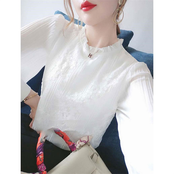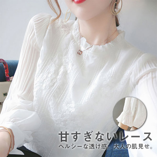 ポイント超超祭利用可 レースブラウス 長袖 レディース チュール シアートップス フリル シースルー オシャレ プルオーバー きれいめ 透けレース かわいい 透け感