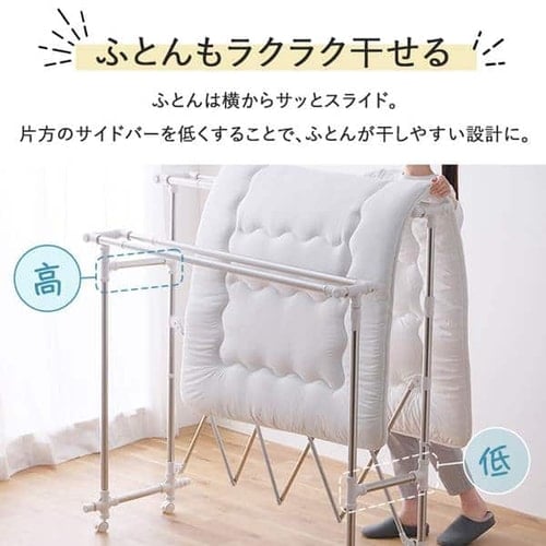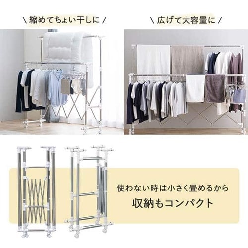 スリムにたためる伸縮式、ふとんも干せる多機能物干し。