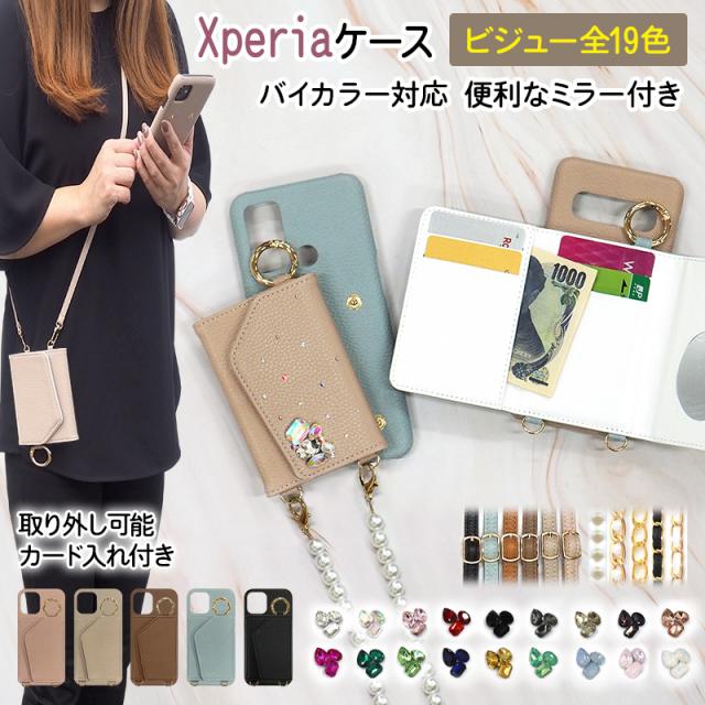 スマホケース スマホカバー Xperia ケース【レザー×カード入れ ミラー ロングストラップ付き×ビジュー&フラットストーン】スマホショルダー 背面収納 カード収納 リング付き 肩掛け 斜めがけ 首掛け ショルダー バイカラー エクスペリア ギフト メール便送料無料 受注生産