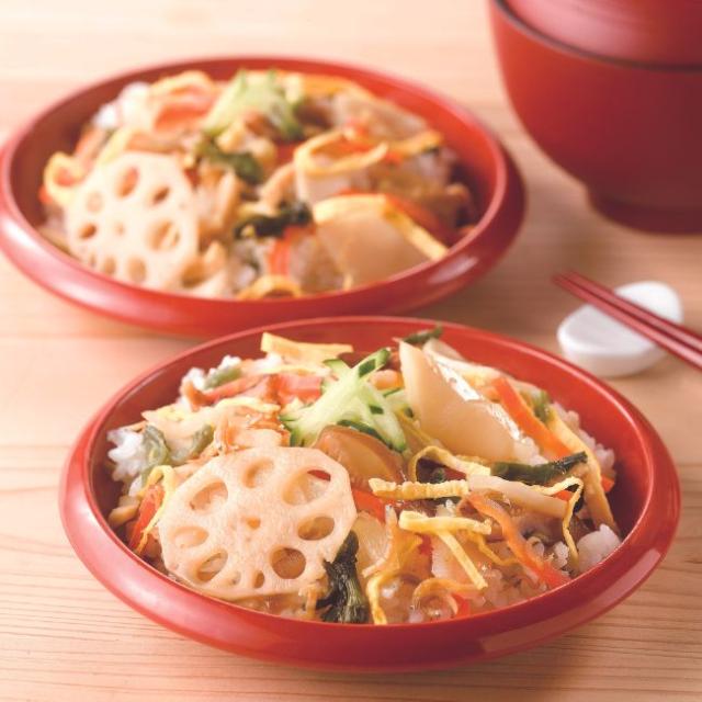 調味酢(糖類(ぶどう糖果糖液糖、砂糖)、醸造酢(小麦を含む)、その他)(国内製造)、筍水煮、乾しいたけ、凍り豆腐(大豆を含む)、干ぴょう、れんこん水煮、しろしょうゆ(本醸造)(小麦・大豆を含む)、塩蔵人参、砂糖、塩蔵みぶ菜、菜の花水煮、本みりん、ちりめんじゃこ、でんぷん、昆布エキス/調味料(アミノ酸等)