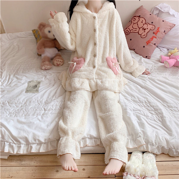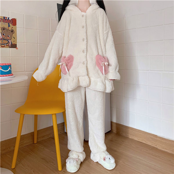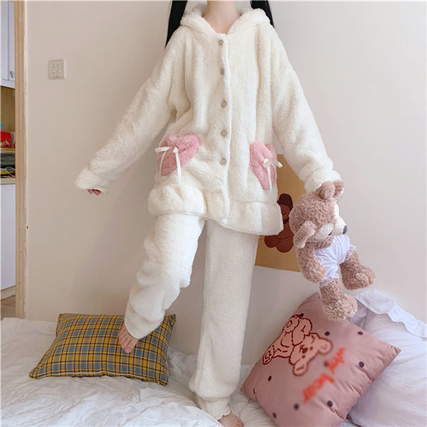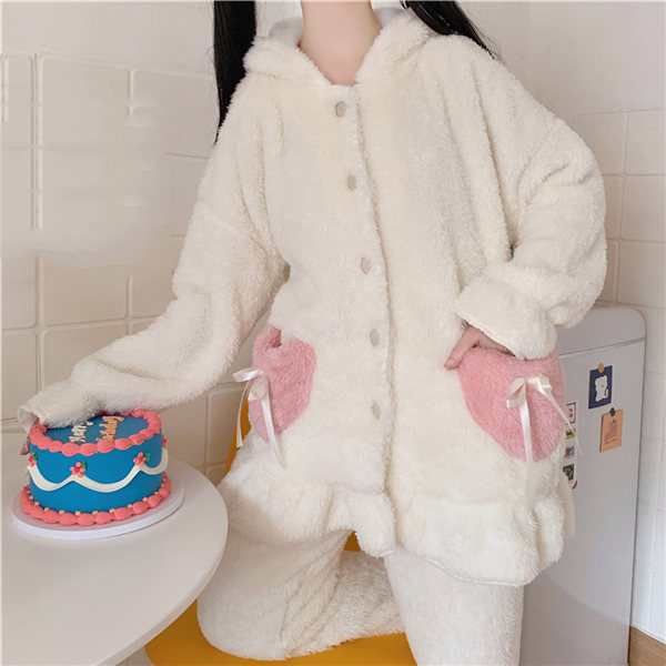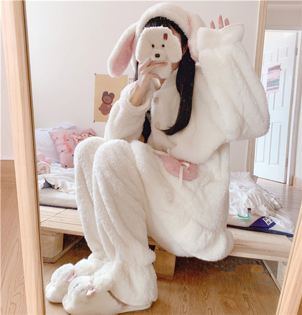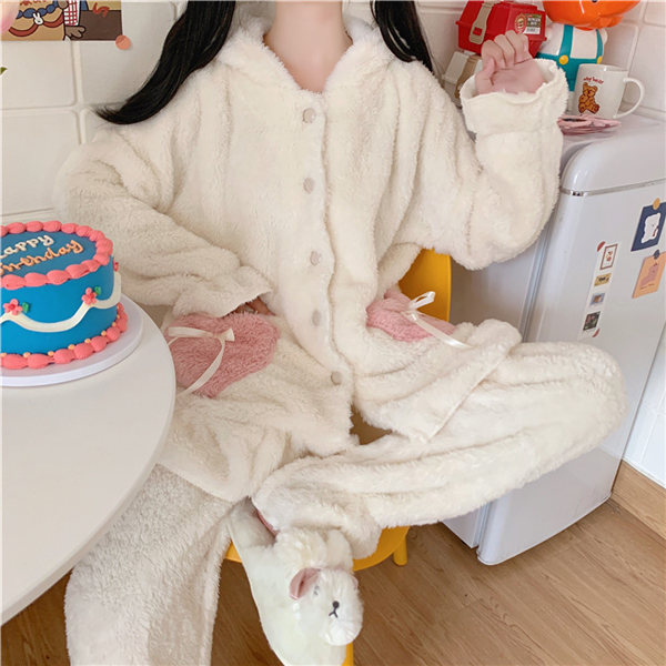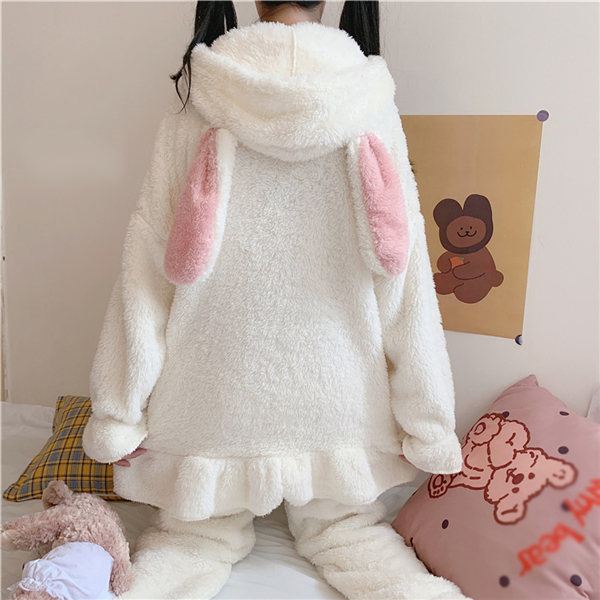 パジャマ レディース 冬 かわいい 長袖 ルームウェア もこもこ 寝巻き 女性用 ふわふわ ふわもこ 前開き 裏起毛 可愛い 韓国 上下セット モコモコ 部屋着 プレゼント 暖かい ロングパンツ 結婚祝い あったか 帽子付き うさぎ耳付き ホワイト5