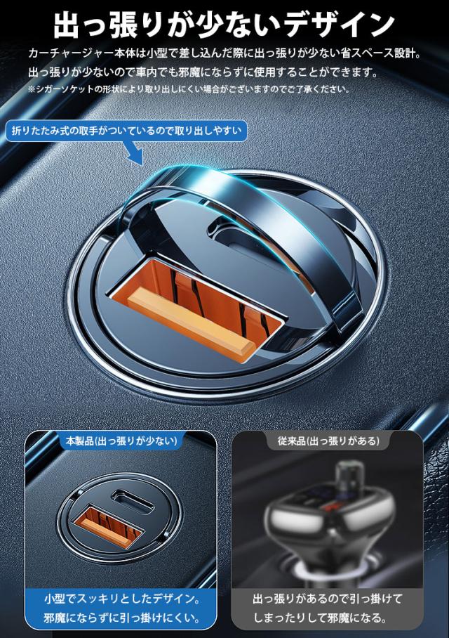 カーチャージャー本体は小型で差し込んだ際に出っ張りが少ない省スペース設計。