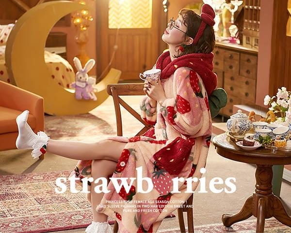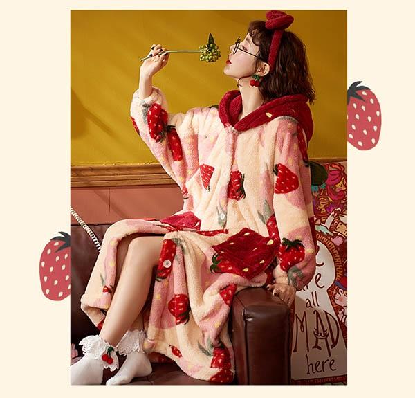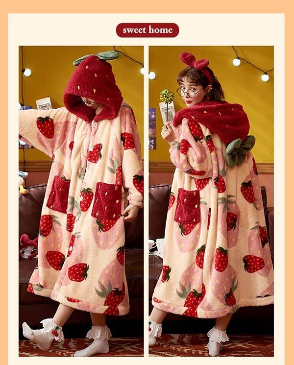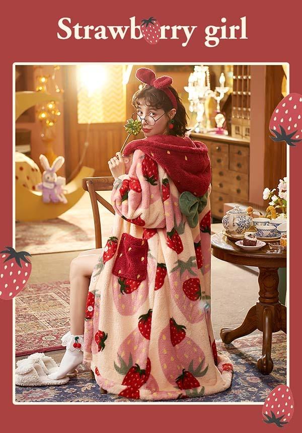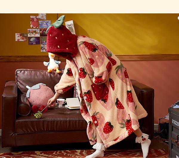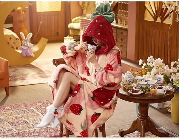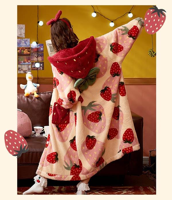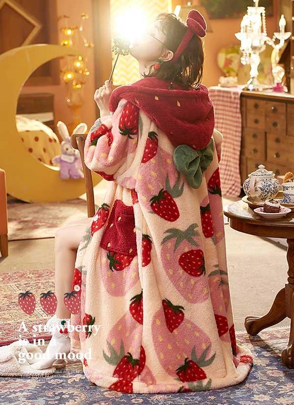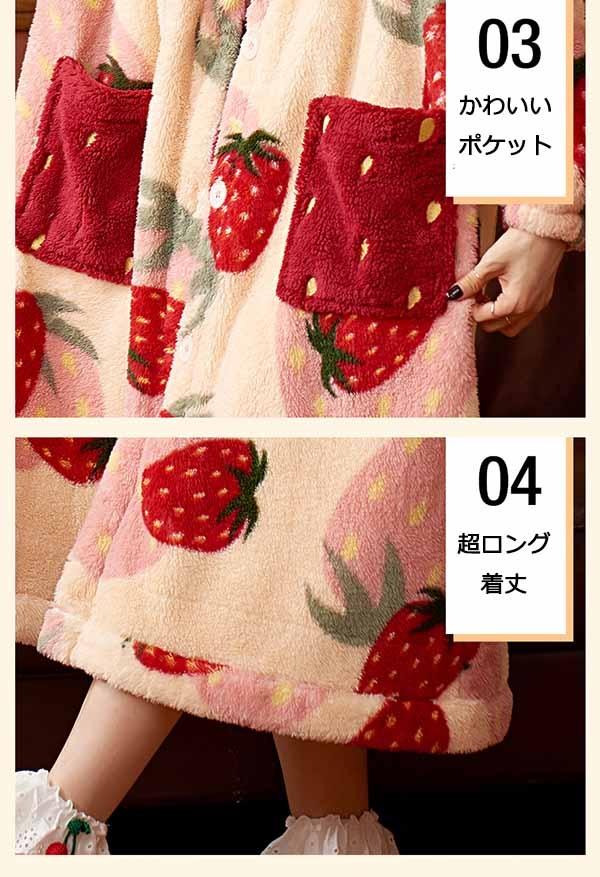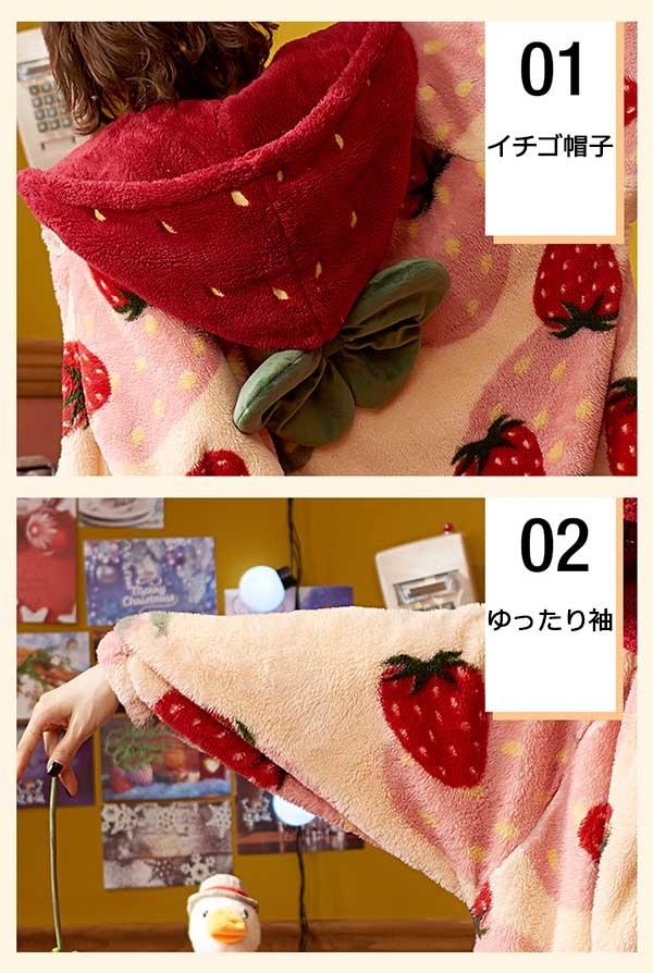 【レビュー投稿で+5%還元】パジャマ レディース いちご柄 マント もこもこ コート 冬 部屋着 寝間着 イチゴ かわいい 大きいサイズ 4L ポケット付き ルームウェア 冬用 あったか モコモコ 帽子付き 誕生日 プレゼント dh024n1