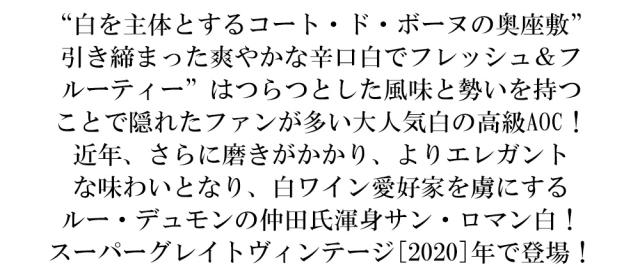 “白を主体とするコート・ド・ボーヌの奥座敷”引き締まった爽やかな辛口白でフレッシュ&フルーティー”はつらつとした風味と勢いを持つことで隠れたファンが多い大人気白の高級AOC!近年、さらに磨きがかかり、よりエレガントな味わいとなり、白ワイン愛好家を虜にするルー・デュモンの仲田氏渾身サン・ロマン白!スーパーグレイトヴィンテージ[2020]年で登場!