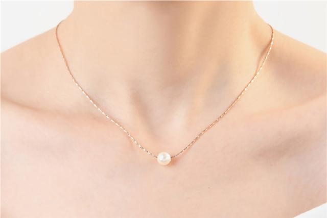 シーンを問わない程良いサイズの一粒パールと、煌めくスエッジチェーンの輝きが胸元にほんのりと上品さを添えます。