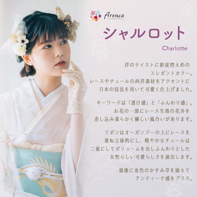 「透け感」と「ふんわり感」をキーワードに、レースやチュール生地を取り入れ、柔らかでふんわりとした、女性らしい可愛さが詰まった髪飾りです。