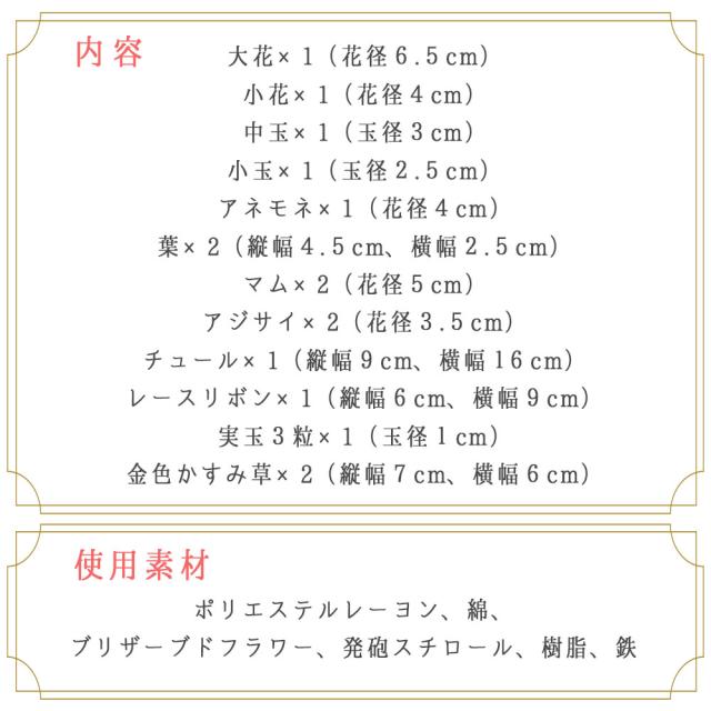 ポリエステルレーヨン、綿、ブリザーブドフラワー、発砲スチロール、樹脂、鉄