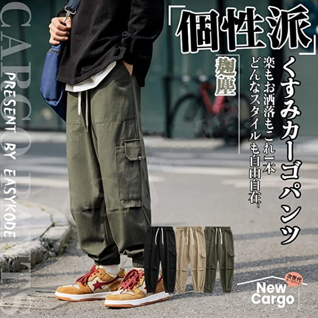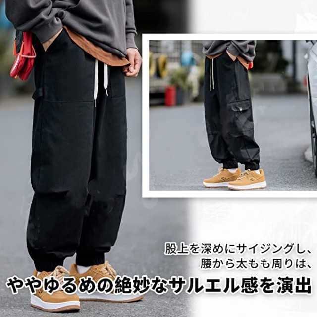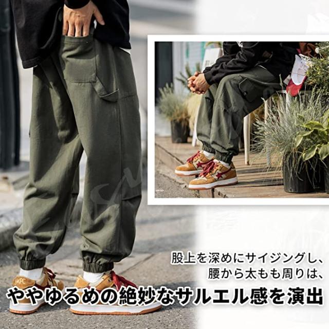 股上を深めにサイジングし、腰から太もも周りは、ややゆるめの絶妙なサルエル感を演出。裾にかけて細身なサイジングにすることにより、コーディネート全体をスマートに魅せてくれます!左足の太もも部分にフラップ付きのカーゴポケットを搭載。フラップは二重構造になっており、アシンメトリー仕様。丈夫で流行りを取り入れたカーゴパンツは、お手頃な値段なこともあり、ストリートファッションや様々なジャンルで大人気です。