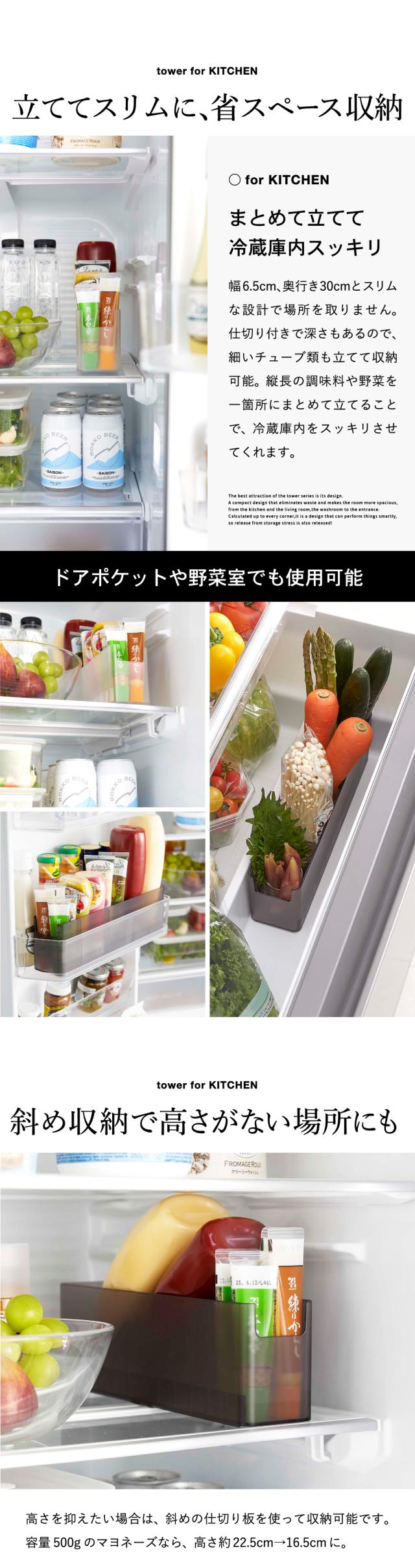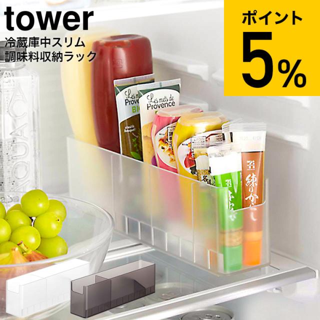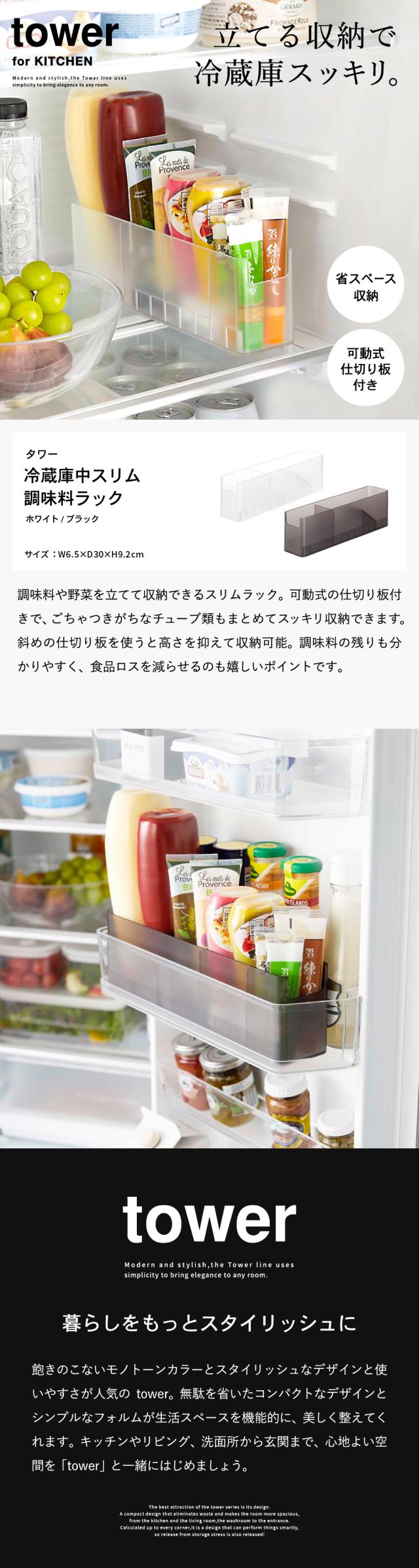 tower 山崎実業 冷蔵庫中スリム調味料収納ラック タワー ホワイト ブラック 8107 8108 冷蔵庫 スリムラック チューブ 調味料 スリム収納 ドアポケット収納 可動式 仕切り板 高さ調節 整理整頓 デッドスペース タワーシリーズ