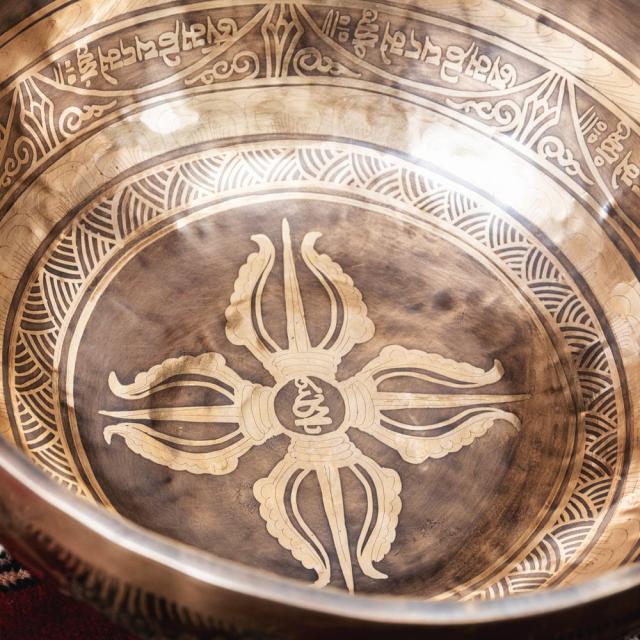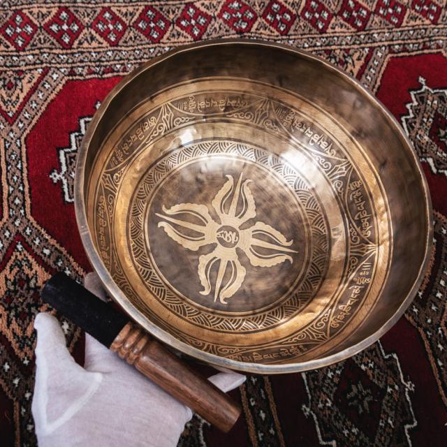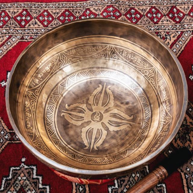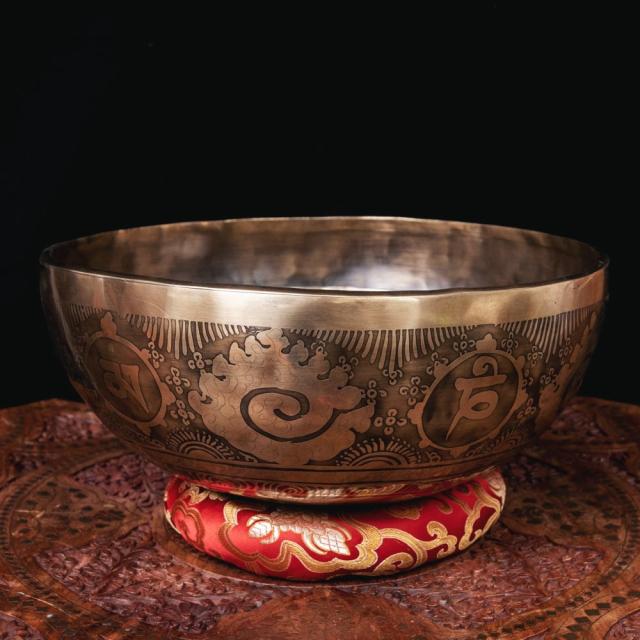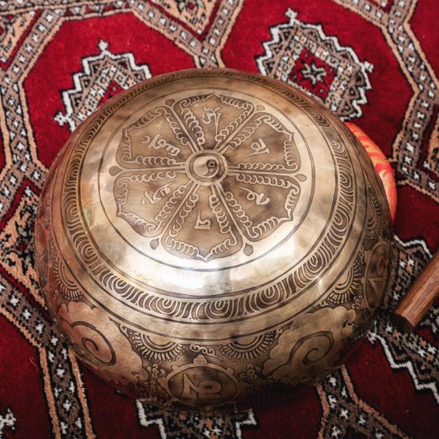 深みのある音色に加え特徴的なのが、職人によって手彫りされた美しい文様です。マントラや、ヴィシュヴァ・ヴァジュラ、アグニ、シャンカなどの吉兆柄に加え、ブッダなどが美しく彫られています。全ての柄をご覧いただけるよう、底面を含め写真に収めておりますので、是非御覧くださいませ。音色だけではなく、視覚的にも楽しく癒してくれる一品です。■シンギングボウルの鳴らし方について■