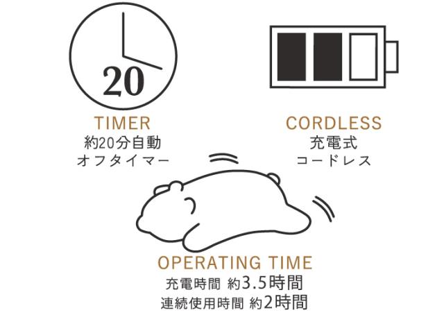 TIMER・・・約20分自動オフタイマーCORDLESS・・・充電式コードレス