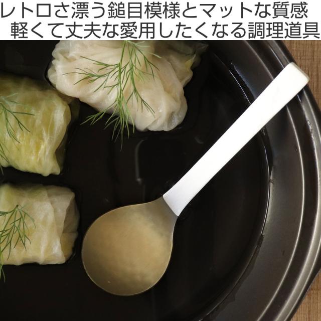 艶感を抑えたマットな質感のアルミ素材に、職人の手仕事で鎚目模様が施されています。1本ずつ職人が丁寧に仕上げたレトロさと洗練された雰囲気が漂うキッチンツールです。