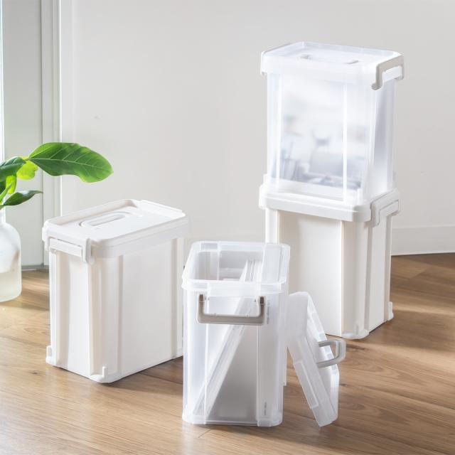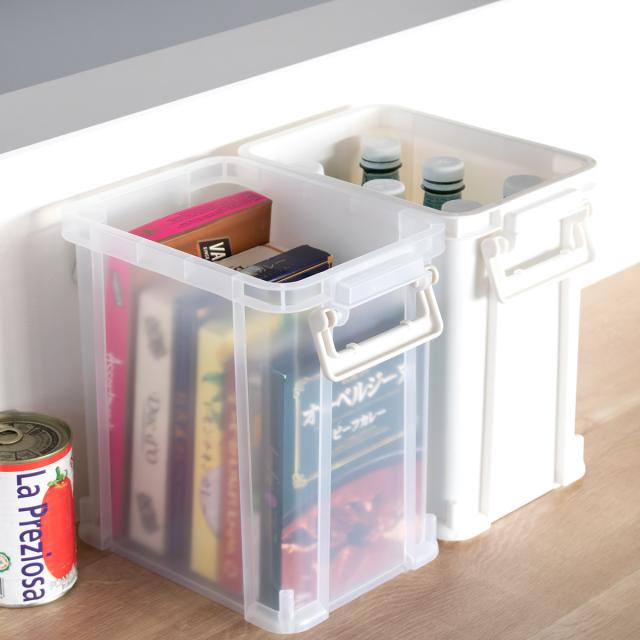 工具やおもちゃ、アウトドア用品、食品ストックなどの収納に便利なサイズです。ホワイトは中身が見えず統一感がありスッキリとした印象になります。クリアは中身が程よく透けて収納物を探しやすいです。