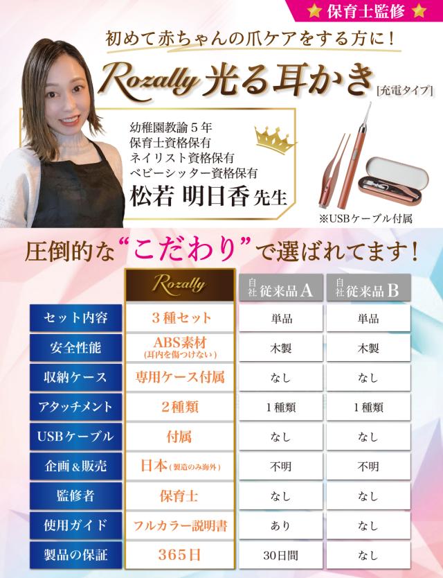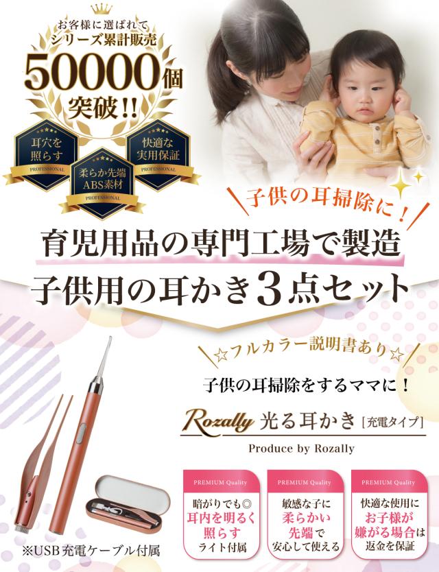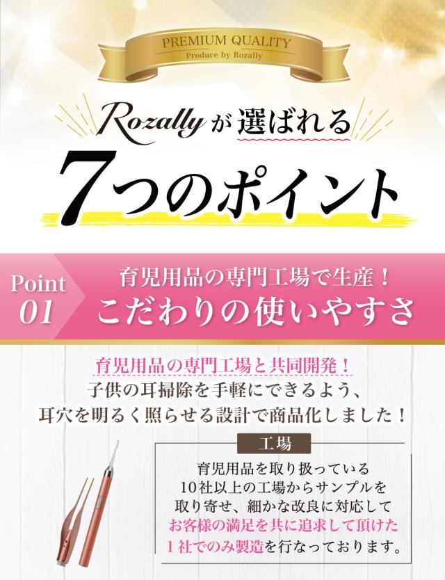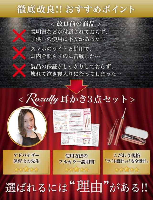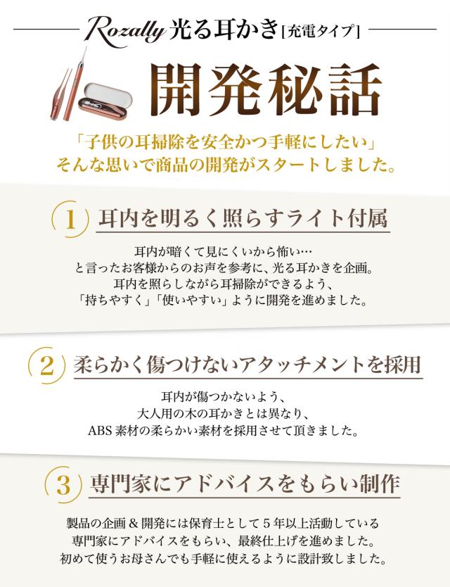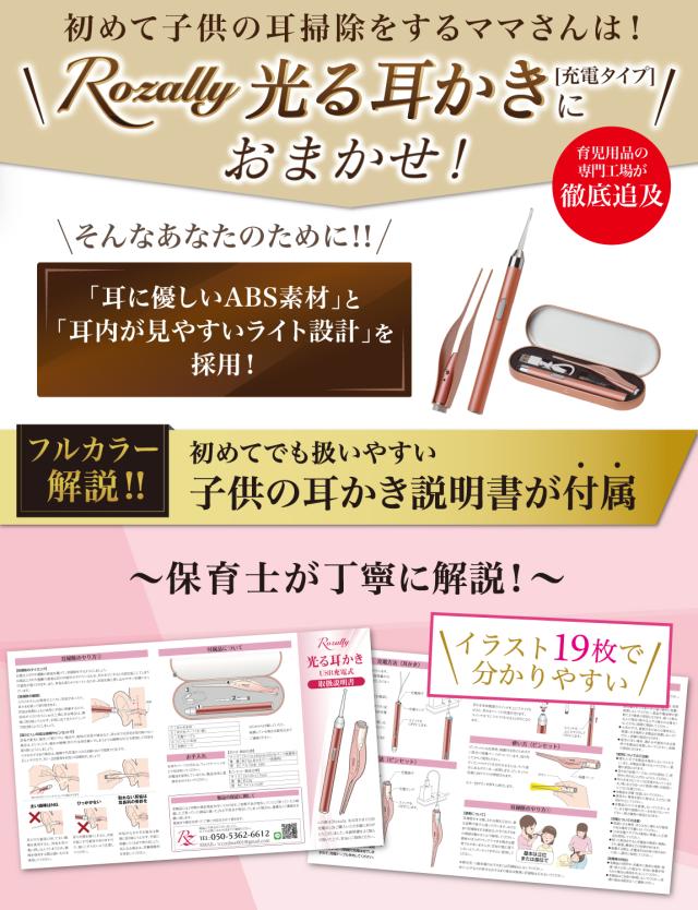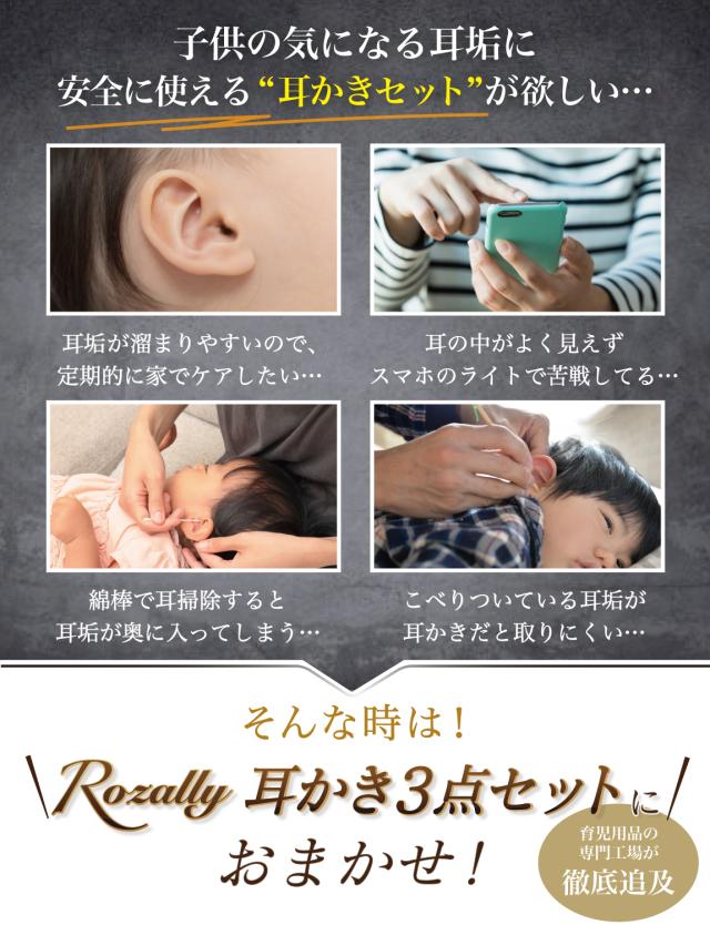 Rozally 耳かき セット 電池ver がついに正式販売開始。 子供 の 耳垢 掃除 のために みみかき と ピンセット が欲しい… というお客様に人気の “先端部が 光る耳かき ”です。 子供 や 赤ちゃん の 耳掃除 では耳穴が暗くて見えにくい… というお声が多く、照明付き の先端部が 光る 設計にすることで 耳 を ライト で照らして 耳掃除 がラクラクできる仕様に改良致しました。 企画&設計では 耳かき や 子育て 全般に に詳しい 【保育士&ベビーシッター】の先生からアドバイスをもらい、 子供用 の 耳垢掃除 や 定期的な 耳かき の 方法 など 色々な使用方法を説明書として添えて企画&開発しました。 |