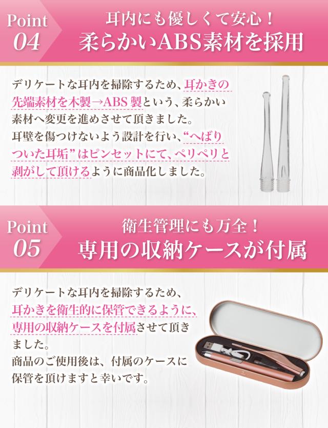 子供 や 赤ちゃん の 耳掃除 では耳穴が暗くて見えにくい…というお声が多く、照明付き の先端部が 光る 設計にすることで 耳 を ライト で照らして 耳掃除 がラクラクできる仕様に改良致しました。