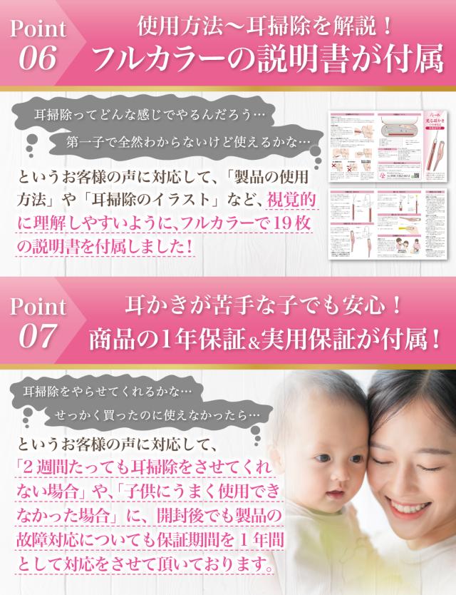 本製品には安心して 耳掃除 して頂けるよう、 商品の使用方法 はもちろん 耳かき ワンポイントアドバイス など 丁寧に使用方法を解説させて頂きました。 女性のお客様1人でも簡単に耳垢掃除ができるよう、 イラスト19枚でフルカラー解説しています。 |