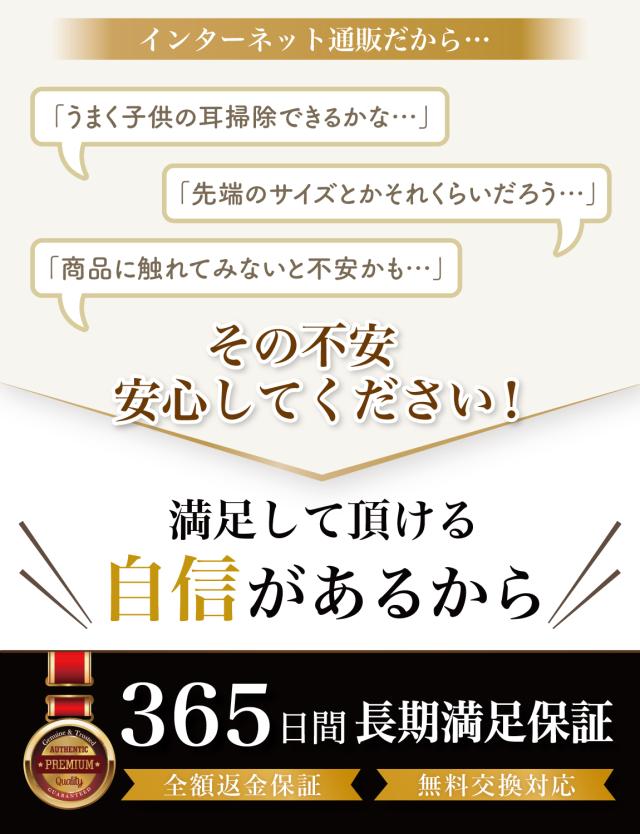 Rozally 耳かき セット 電池ver は品質にこだわり、 工場と交渉をおこなって素材選定から進めています。 出荷前の検品などは十分に行わせて頂いているのですが、 輸送中に破損や汚れの付着など稀に発生してしまうケースがあります。 不具合などが発生してしまった場合でも、 製品には1年間の長期保証を付属させて頂いておりますので、 すぐに交換品の手配をさせて頂きます。 また本製品には上手く 耳掃除 をして頂くことを最優先に考え、 「2週間ほど使用しても上手く使いこなせなかった」という場合に、 ”開封後”でも”使用済み”でも全額の返金保証を付属させて頂いております。 |