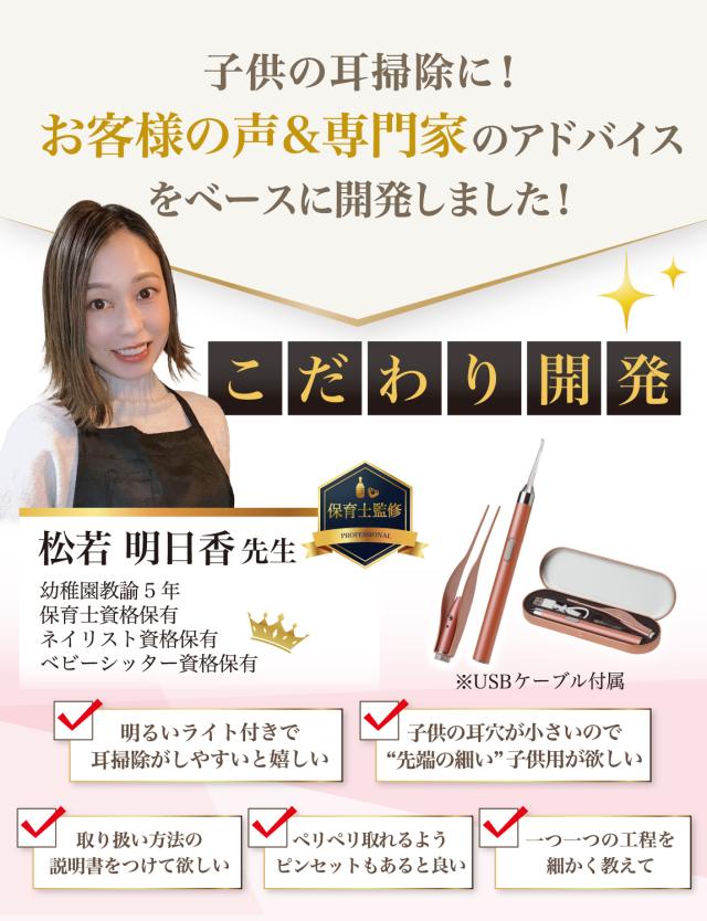 企画&設計では 耳かき や 子育て 全般に に詳しい【保育士&ベビーシッター】の先生からアドバイスをもらい、 子供用 の 耳垢掃除 や 定期的な 耳かき の 方法 など色々な使用方法を説明書として添えて企画&開発しました。