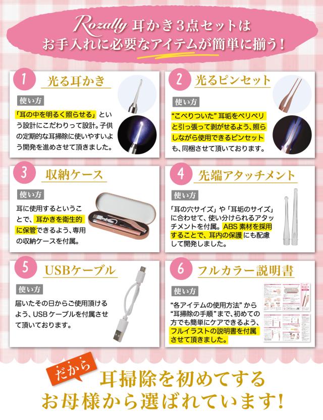様々なメーカーから 子ども用 の みみかき 用品として ” 耳掃除セット ”や” 光る耳かき + ピンセット ”が販売されていますが、 Rozallyの 耳かき セット 電池ver は”こだわり”が一味違います。 照明付き耳かき や 照明付きピンセット など 育児&子育てアイテムをメインに取り扱っている 10社以上の工場からサンプルを取り寄せ、 「使いやすさ×安全性」を一緒に試行錯誤して頂けた1社に絞って発注を行なっています。 製造カラーについても かわいい 単色3カラーにて展開をさせて頂きました。 送料無料となっていますので、 「出産祝い」や「産後祝い」のプレゼントなどにもご愛用頂いております。 |