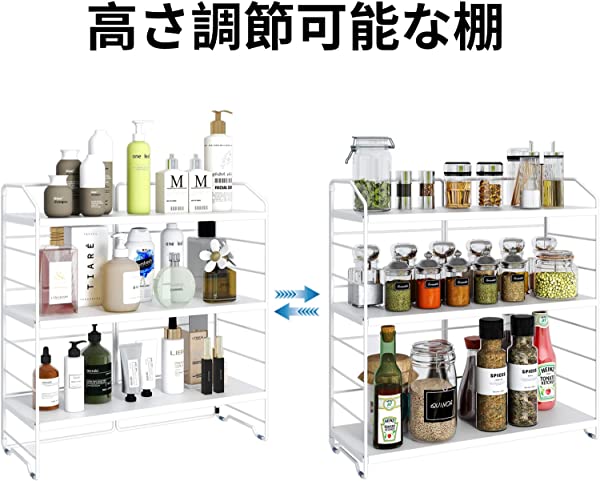 多機能収納ラック: この3段式収納ラックは、ほとんどキッチン、食卓、寝室、オフィス、調味料入れ、化粧品収納、薬缶、お茶コーナー、事務用品、観葉植物置き棚、浴室置き棚などとして用途に合わせてアレンジ可能。
