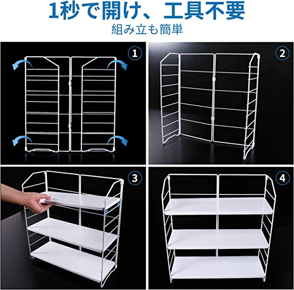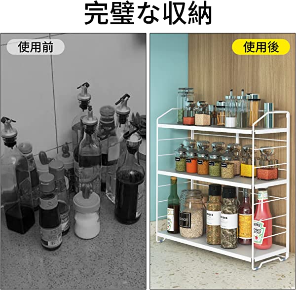 組立も不要、折りたたみキッチン用品:この調味料収納ラックは既に完成品で、面倒な組立も不要です。「部品が足りなく、商品を使うこともできません」という悩みが一切ありません。梱包から調味料ラックをだ出して、展開してすぐ使え、便利です。