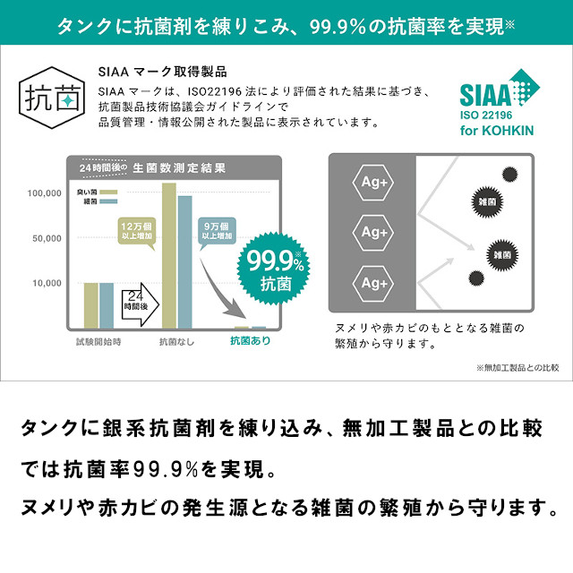 タンクに施された抗菌効果は99.9%の抗菌率を実現。