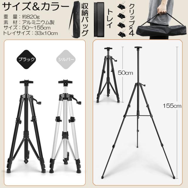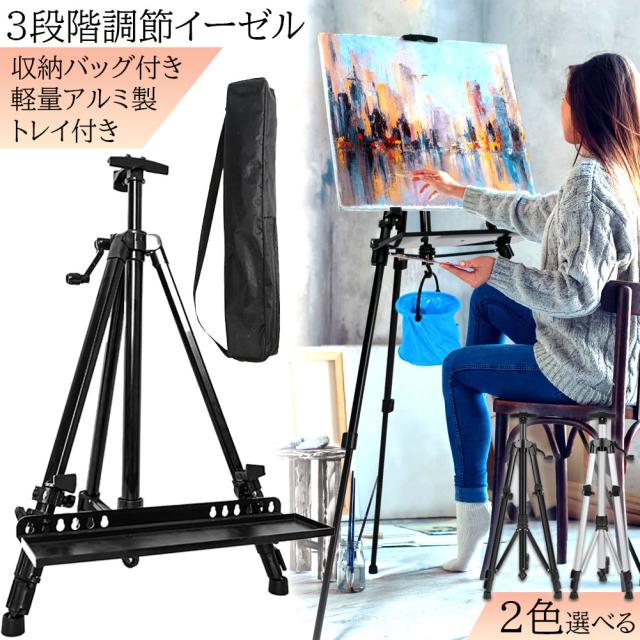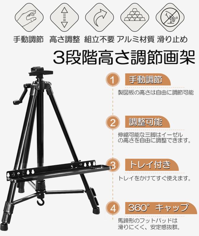 【アルミニウム製3段階調節】50〜160cmまでを調整可能なイーゼルは、ハンドルで高さを調整でき、ニーズに応じて自由の高さ調整が可能です。 軽量なアルミニウムから作成したイーゼルスタンドなので耐久性が良く、丈夫さおよび安定性に優れています。すばらしい細工により、各素材の表面は精密研磨を施し、手を傷付ける心配はありません。【安定性の良い三脚】接地部分は可動式ゴム足を採用している同時にまた広いス三脚タンドが付いているので、揺れることも無く、安定性に優れています。安定性が良い3脚のフレームワークを使用し、 アルミニウム素材を採用し、安定性に優れていて,軽くて頑丈なイーゼルです。