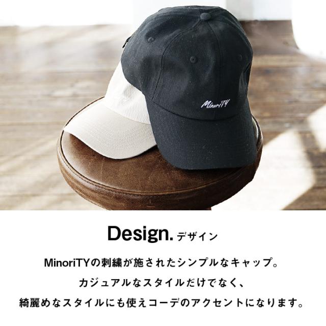 MinoriTYのロゴ刺 が施された、浅すぎず、深すぎない、ちょうど良いサイズ感のキャップ。使い勝手が良く、どのようなスタイルにも合わせやすい大人のロゴキャップです。