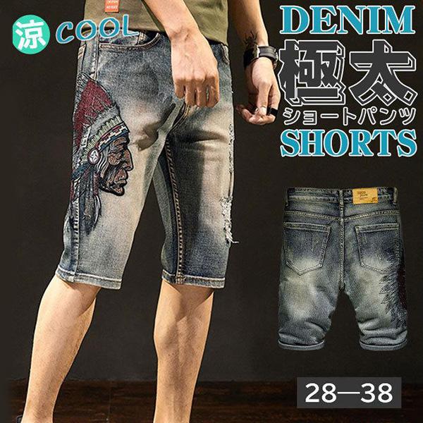 デニム ショートパンツ メンズ 刺繍 ダメージ ハーフパンツ 短パン アメカジ ジーンズ 夏 ストリート ダメージ カジュアル 大きいサイズ おしゃれ