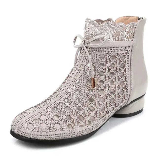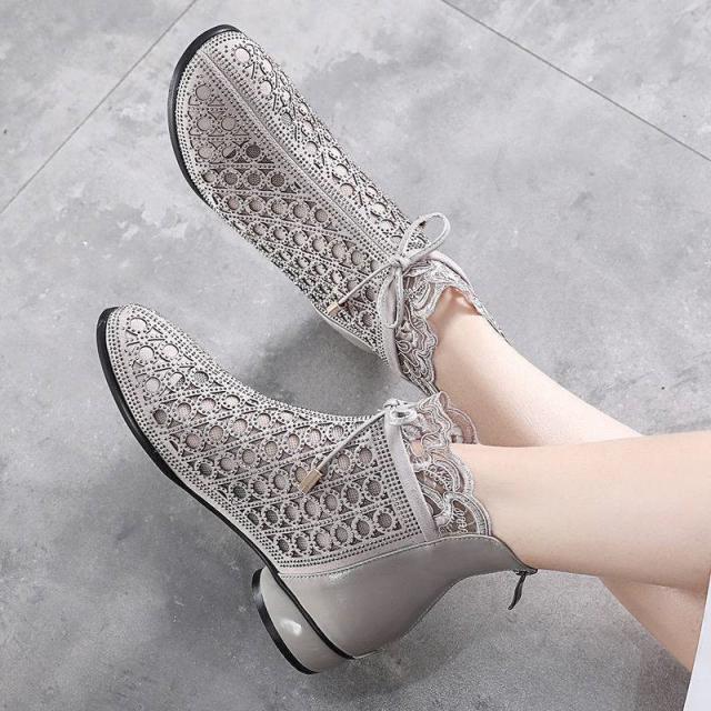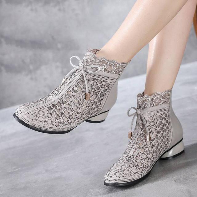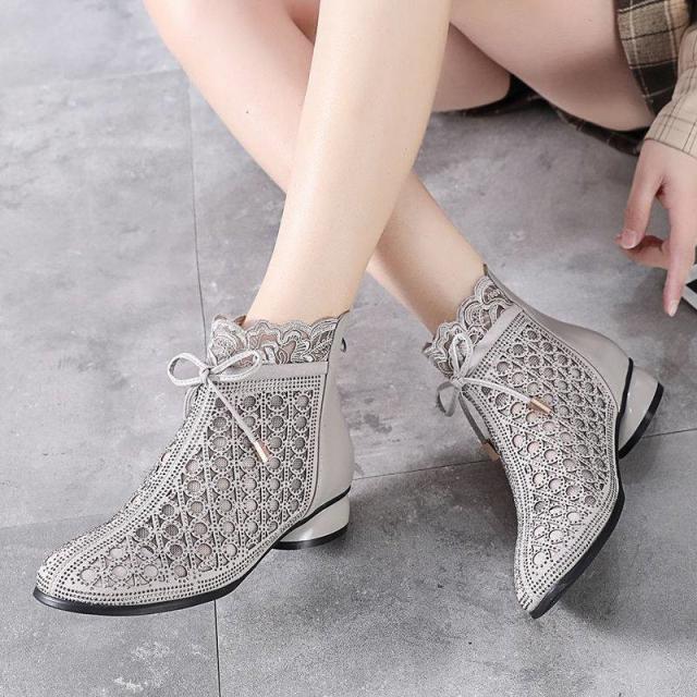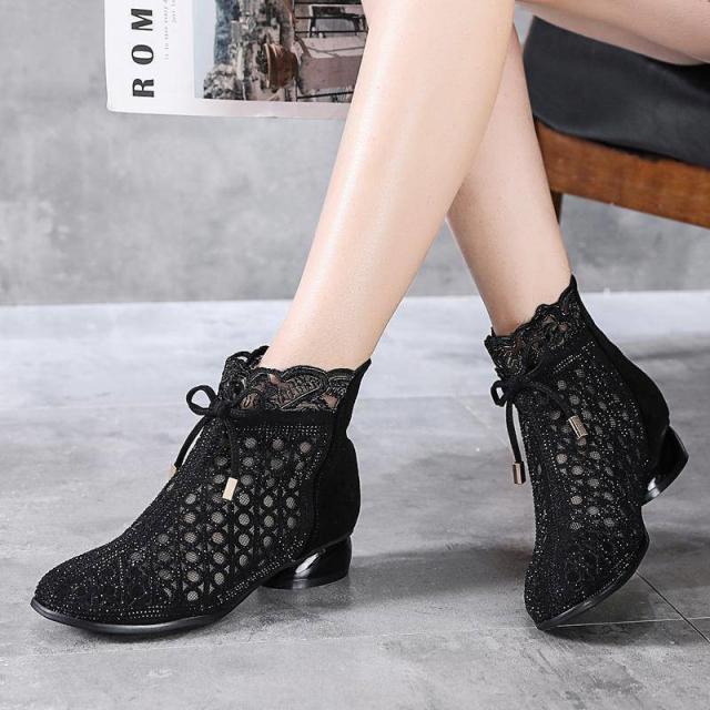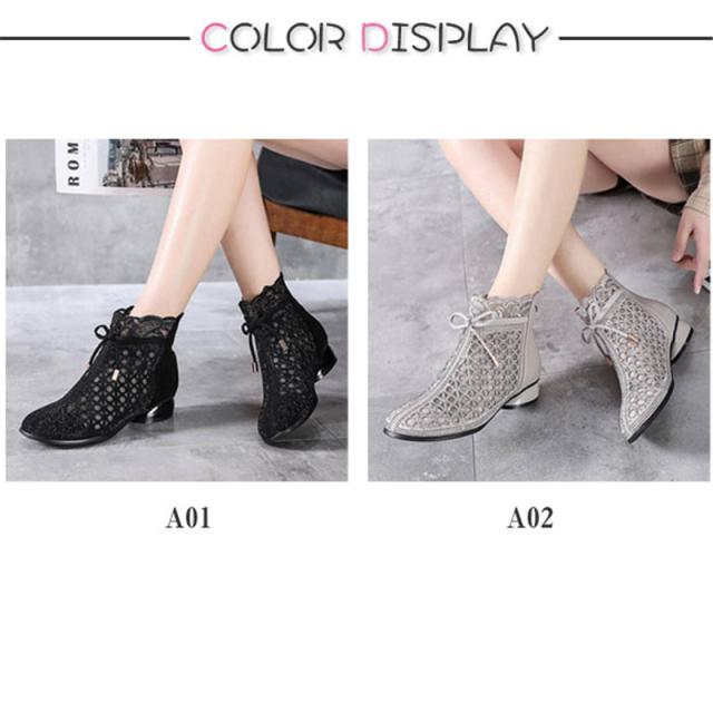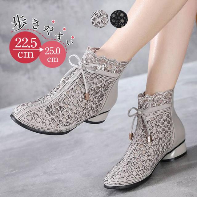 サマーブーツ サンダル レディース 夏 秋 美脚 リボン 太ヒール 通気 透かし ショート丈 カジュアル 歩きやすい 疲れない 大人 新作 婦人靴