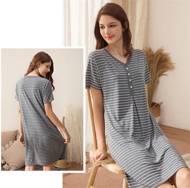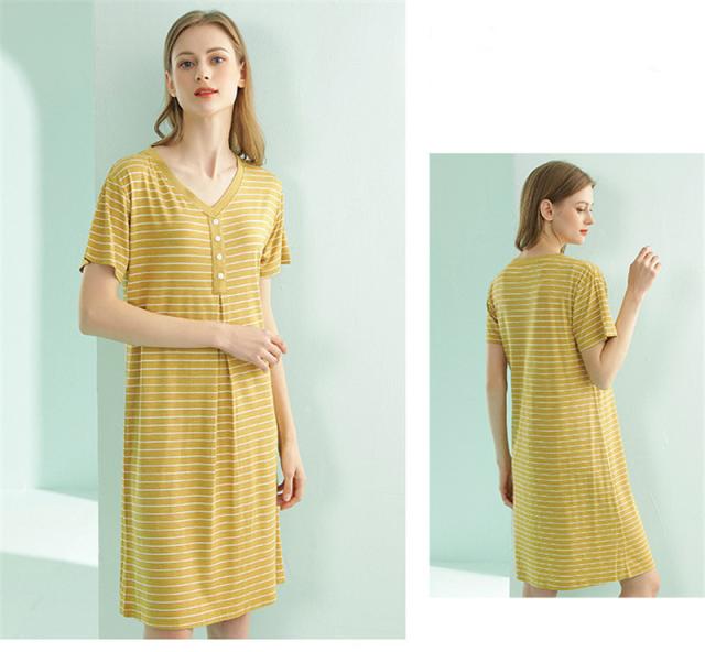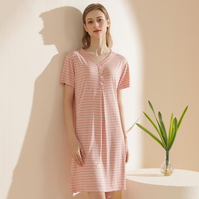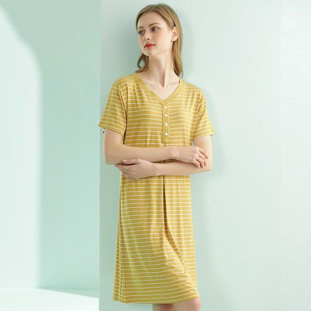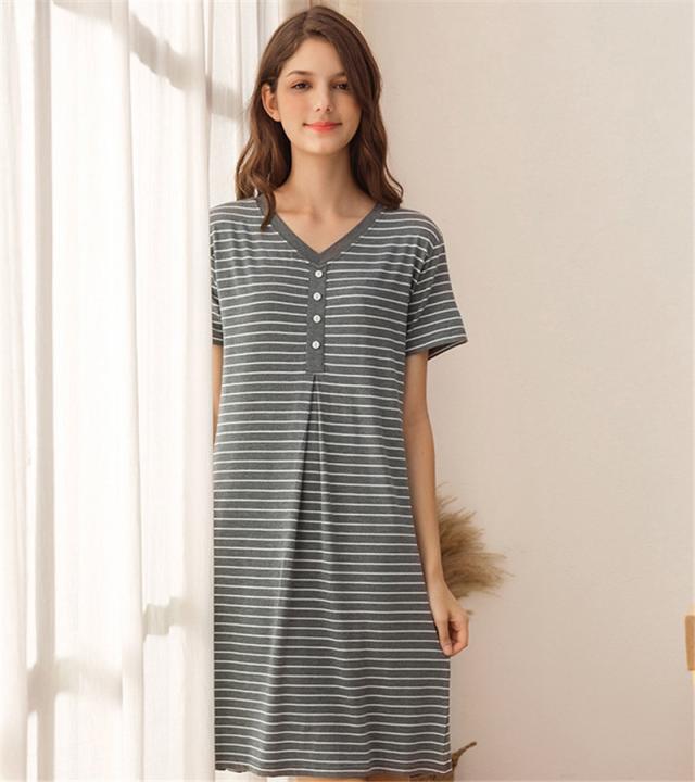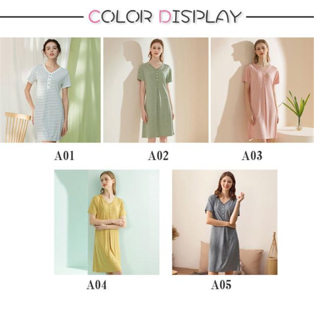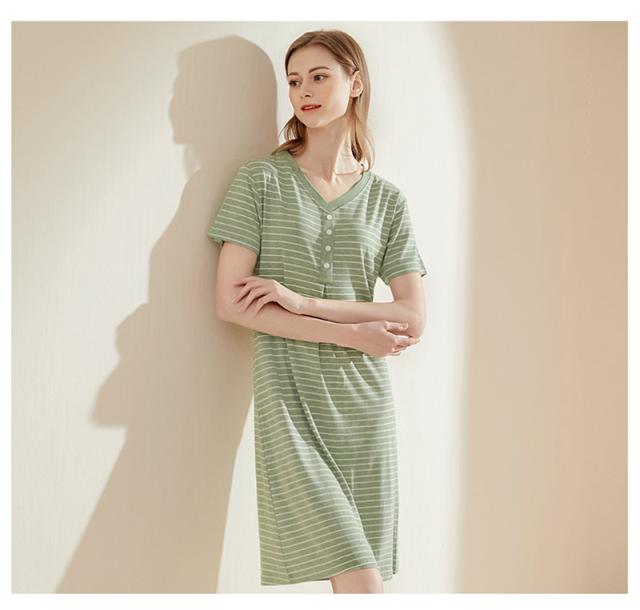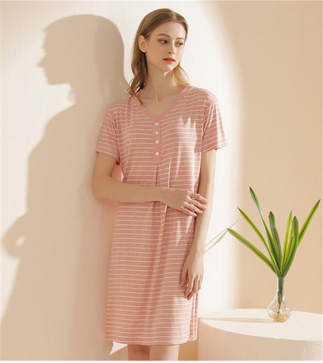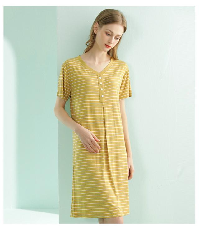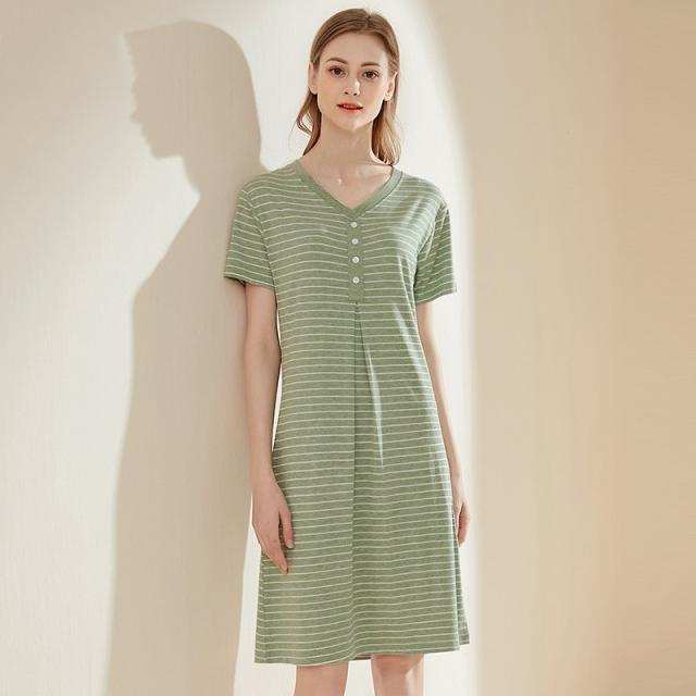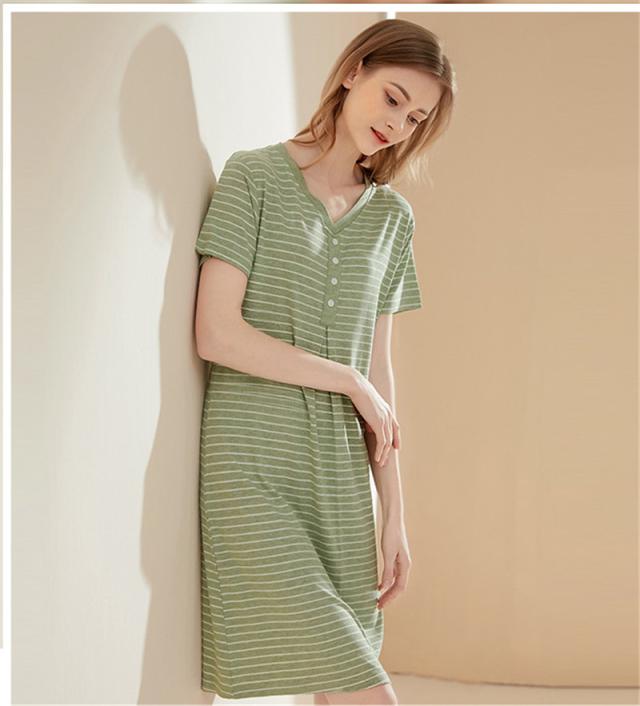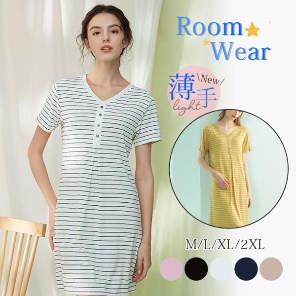 パジャマ レディース ルームウェア 半袖 Vネック 寝巻き 春夏 ボーダー柄 ネグリジェ ワンピース 寝間着 部屋着 マタニティ 薄手 体型カバー