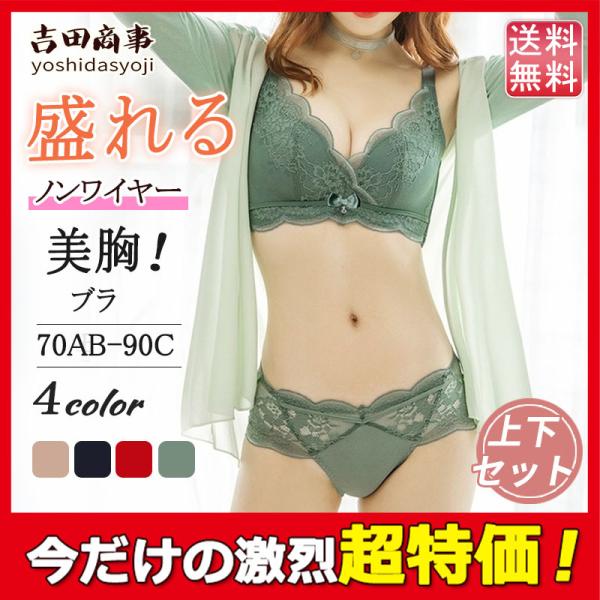 ブラジャー ショーツ 2点セット セクシーランジェリー レース つけ心地 花柄 リボン付き ブラ ノンワイヤー 4段ホック 下厚パッド付き
