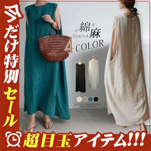 ワンピース レディース 半袖ワンピース リネン風 ノースリーブ ゆったり マキシ丈 大きいサイズ 夏 おしゃれ 通勤 カジュアル 涼しい 送料無料