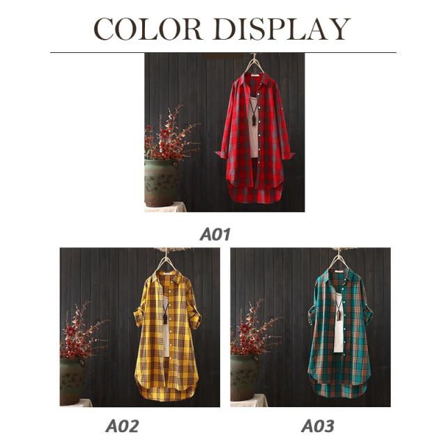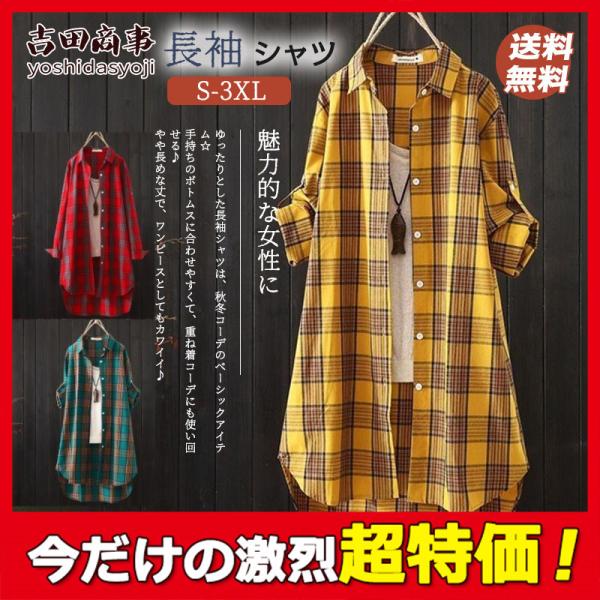 シャツ レディース トップス チェック柄 長袖 ブラウス 前開き ロングシャツ 大きいサイズ 羽織 春秋 体型カバー ワンピース カジュアル おしゃれ