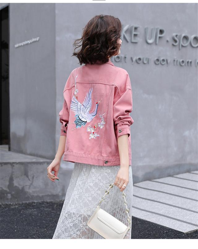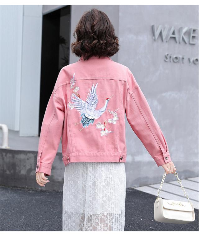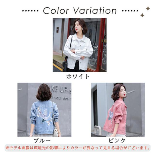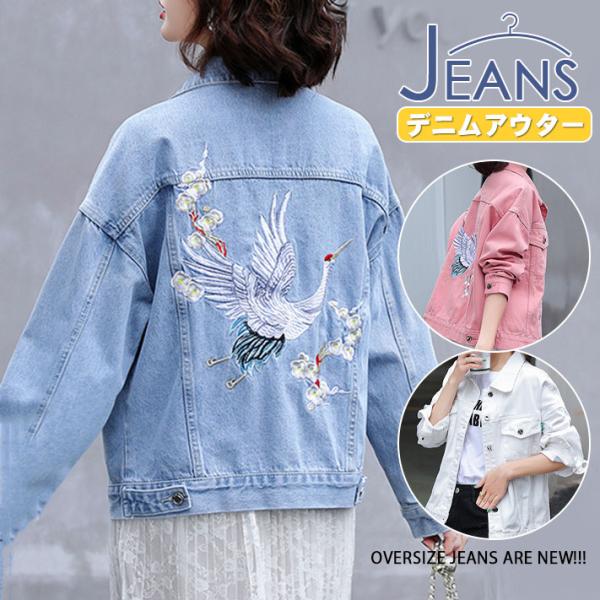 デニムジャケット レディース 刺繍 鶴柄 アウター Gジャン カジュアル おしゃれ ビッグシルエット 大きいサイズ オーバーサイズ 羽織 ゆったり