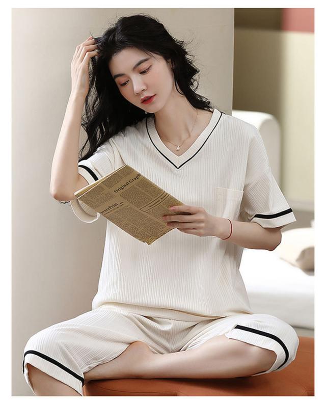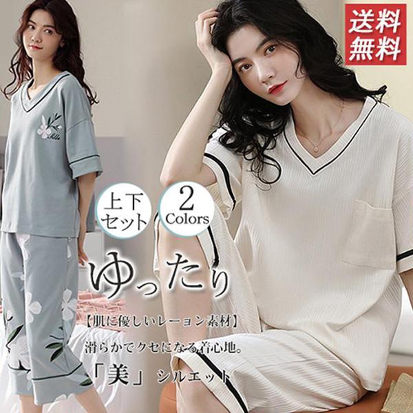 パジャマ レディース 上下セットVネック 半袖 七分丈ズボン 綿 ルームウェア セットアップ ナイトウェア 部屋着 寝間着 春 夏 送料無料