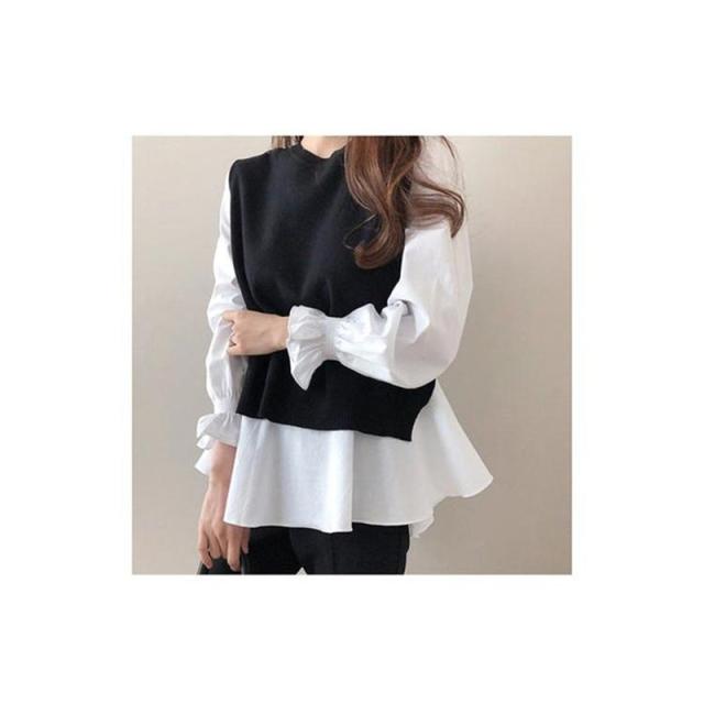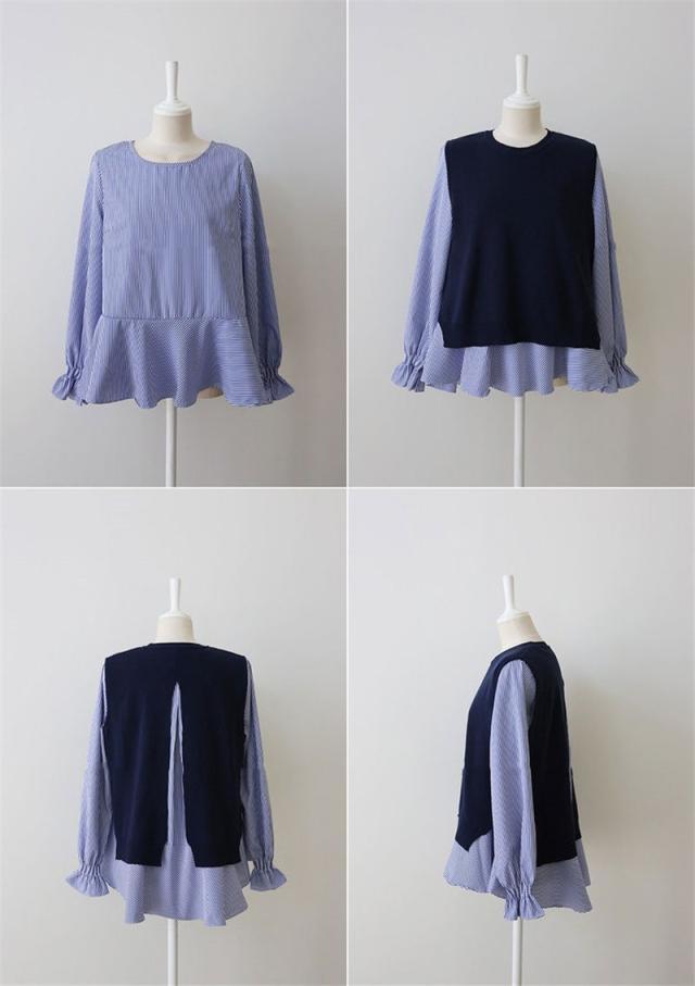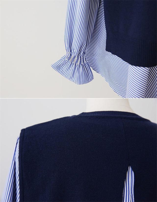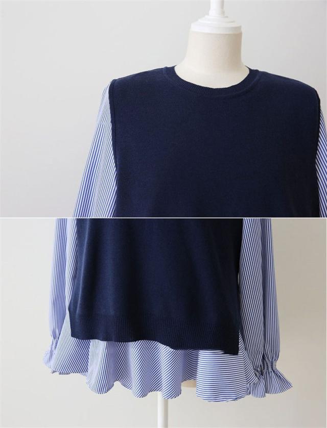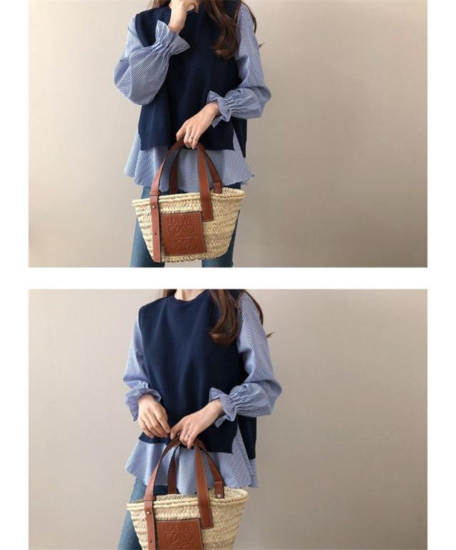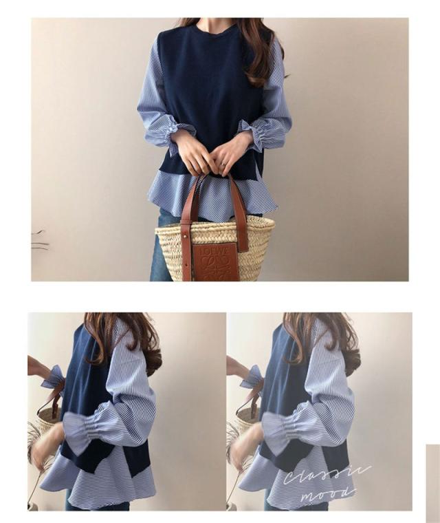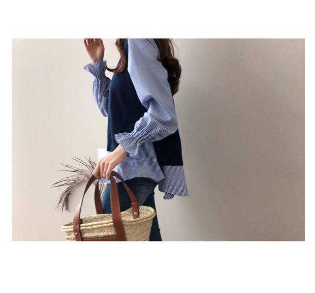 【2点セット】ベスト レディース ニット レイヤード ニットベスト シャツブラウス 長袖 重ね着風 ベルスリーブ おしゃれ ストライプ柄 春秋