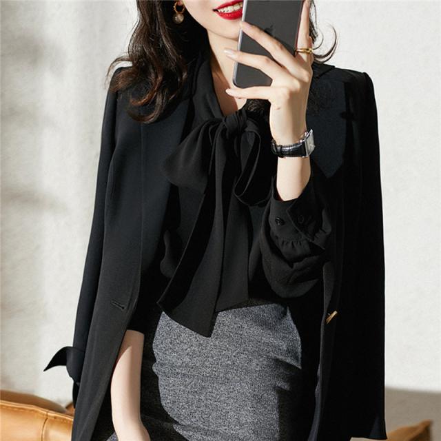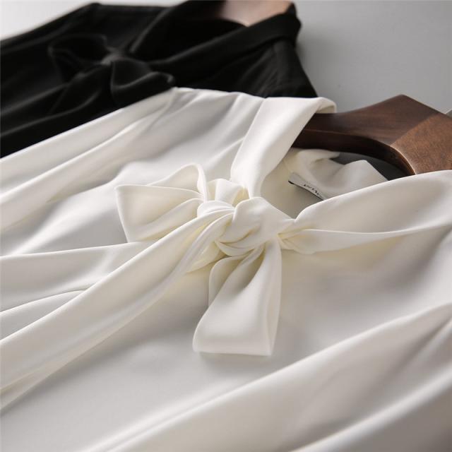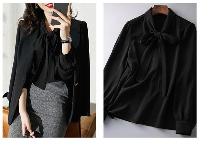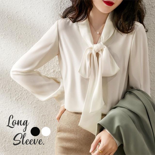 【一部即納】ブラウス レディース 白 黒 ボウタイシャツ シャツ トップス 無地 長袖 リボン シフォン ホワイト ブラック オフィス カジュアル 送料無料
