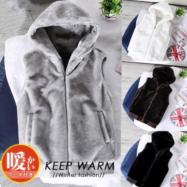 ファーベスト 毛皮ベスト メンズ 暖かい 裏ボア かっこいい ジレ フード 厚手 保温 ファスナー アウトドア フード付き アウトドア 防風 秋冬