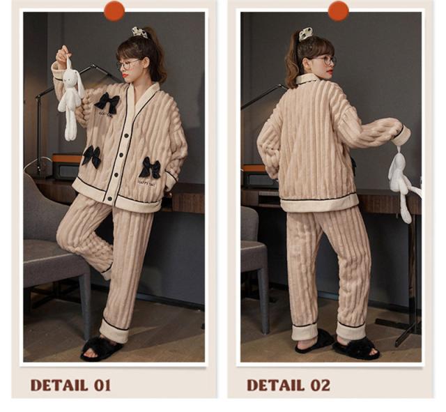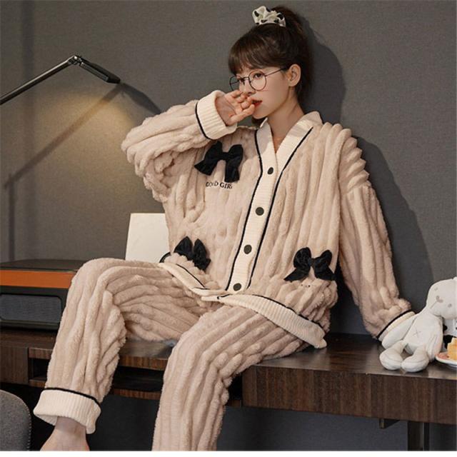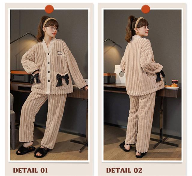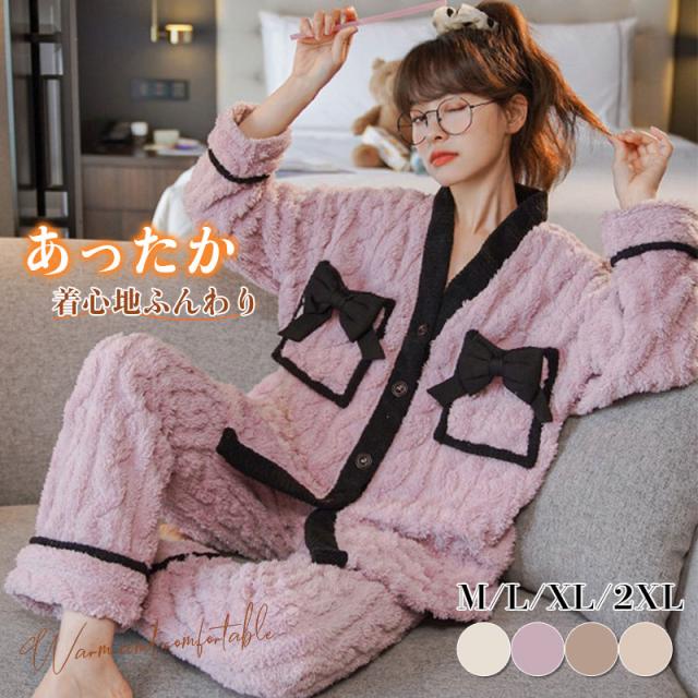 パジャマ ルームウェア レディース Vネック 厚手 リボン 寝巻き 秋 冬 長袖 寝巻き 防寒 部屋着 かわいい カジュアル もこもこ あったか