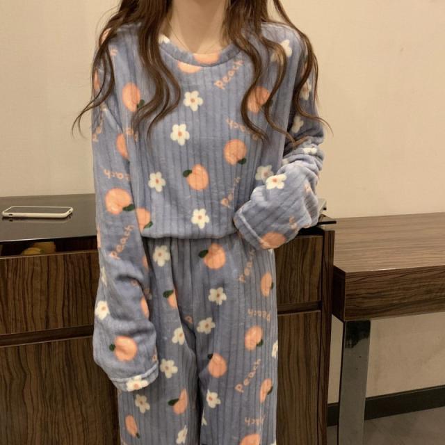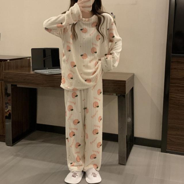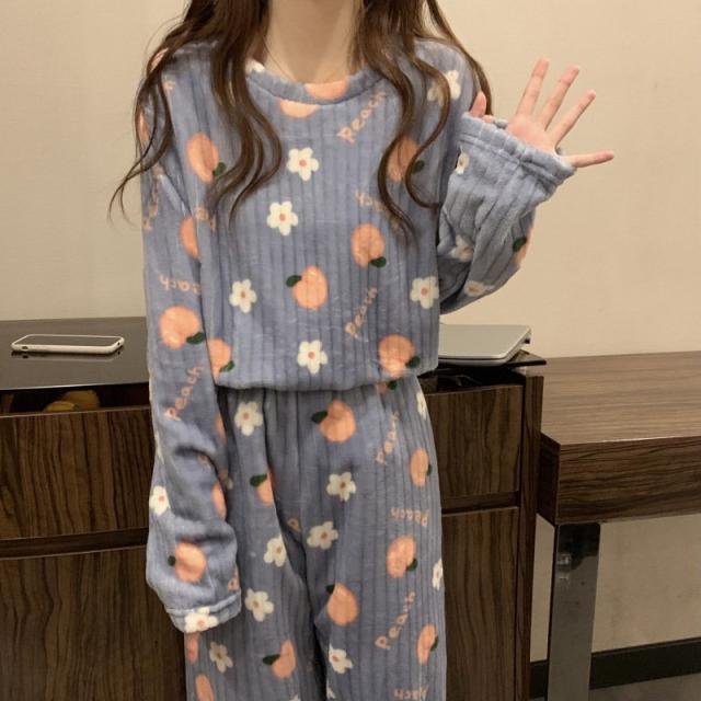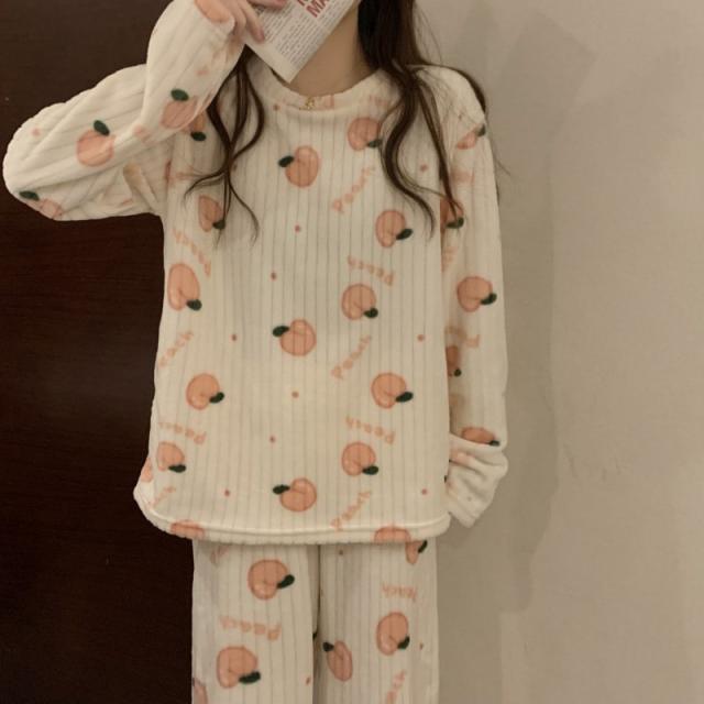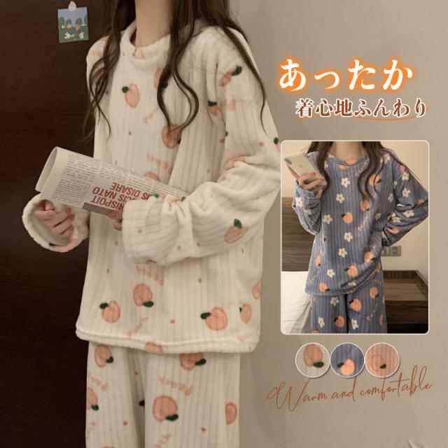 パジャマ ルームウェア レディース 可愛い 寝巻き 秋 冬 桃柄 長袖 寝巻き 防寒 上下セット 部屋着 かわいい もこもこ あったか おしゃれ