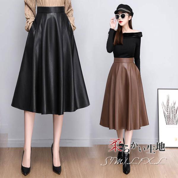 レザースカート レディース 膝丈 ミモレ丈 ウエストゴム フェイクレザー スカート フレア ハイウエスト おしゃれ 可愛い 通勤 細見え 送料無料
